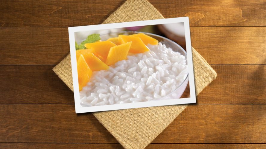 Escorra o arroz e volte-o para a panela. Despeje a calda de coco ainda quente sobre o arroz, misture delicadamente e abafe, até que o arroz fique macio, mas não desmanchando. Coloque o arroz em taças individuais e leve à geladeira, por cerca de 1 hora. Na hora de servir, acomode pedaços de manga sobre o arroz e decore com folhas de hortelã.